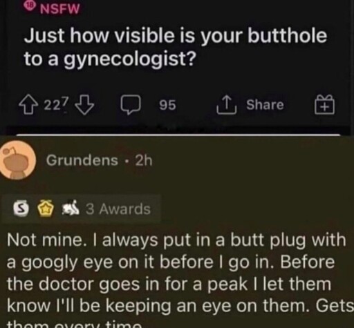 minus-squareaeronmelon@lemmy.worldlinkfedilinkEnglisharrow-up149·edit-212 days ago“I’m on my fourth gynecologist. Some people just can’t take a joke.”