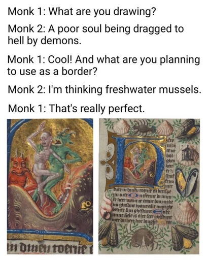 A drawing of a naked person being dragged away by a green demon; the drawing is surrounded by a border with various drawn mussels and clams. The caption reads “Monk 1: What are you drawing? Monk 2: A poor soul being dragged to hell by demons. Monk 1: Cool! And what are you planning to use as a border? Monk 2: I’m thinking freshwater mussels. Monk 1: That’s really perfect.”
