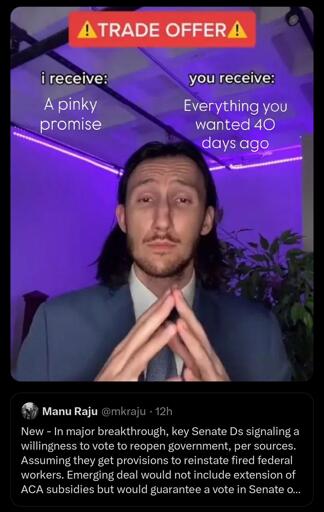 ComradeSharkfucker@lemmy.ml to Memes@lemmy.mlEnglish · 8 days agothey almost used their political powerlemmy.mlimagemessage-square27linkfedilinkarrow-up1240arrow-down11file-text