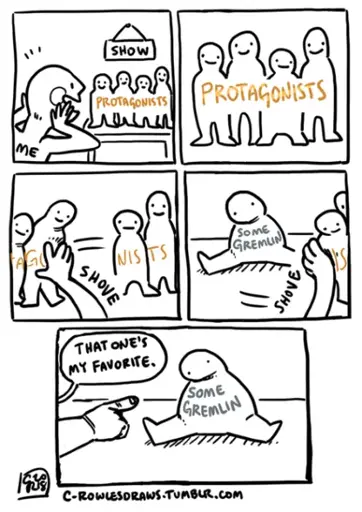 Panel 4: “Me” keeps shoving Protagonists aside, revealing a person sitting on the floor labeled “Some Gremlin.”
