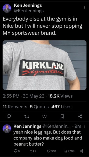 Kirkland is the cheaper store brand so advertising that on your body is kind of funny. I guess since it’s membership only its the higher-end cheaper option.