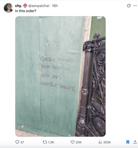 Don’t know what chicken fingers would be, but palm reading could be “B”, handjobs “O”, and knuckle sandwich “S”