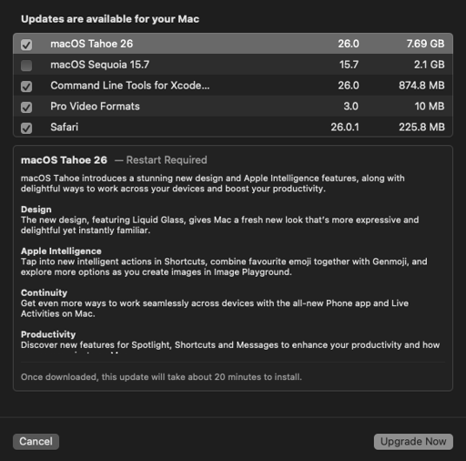 PSA: It is important to read all the software update buttons. Even if you ignore the first big Tahoe ad (same will apply to pads and phones), and just choose to “update”, the upgrade to Tahoe is checked by default and the button will read “Upgrade”.