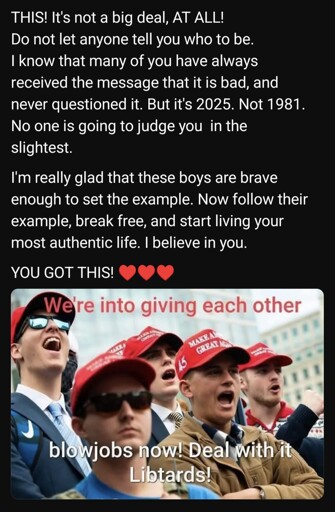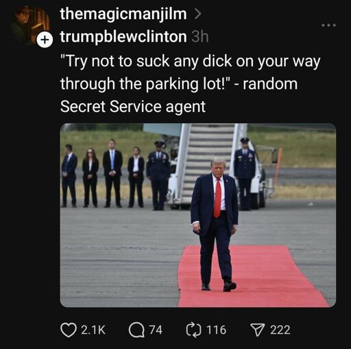 Oh and if someone does argue and say that’s untrue, the entire group jumps on that person calling them brainwashed, a sheep, etc. and the fact thar someone replied in the first place only boosts the algorithm and gets it seen by more people. any engagement is good engagement, as far as algorithmic content is concerned. they actually pretty masterfully designed this. it’s clever as hell, and it’s very insidious. i mean fuck those guys seriously but their masters really did game the algorithm and the false info game masterfully.